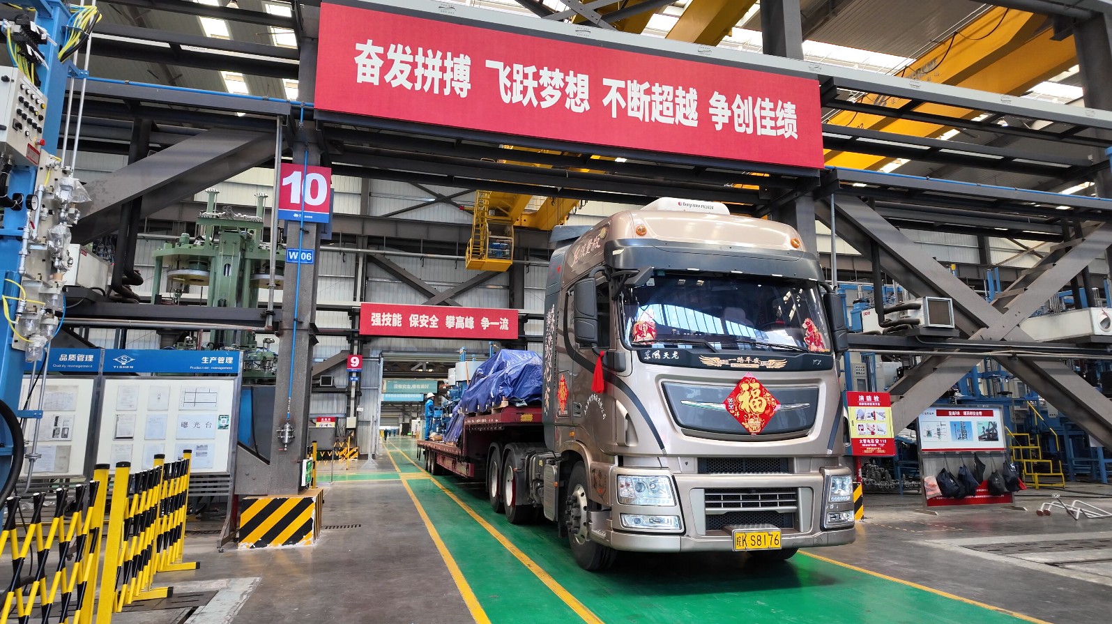 2月24日,开工第一天,益阳橡机生产的52吋导柱式液压硫化机顺利通过国内外客户的线上试车验收,成功发货,一辆辆满载硫化机包装箱的货车整齐排列,陆续驶出益阳基地,奔赴国内某著名轮胎公司,这是中化橡机益阳基地新春上班第一天发运的大规模硫化设备。